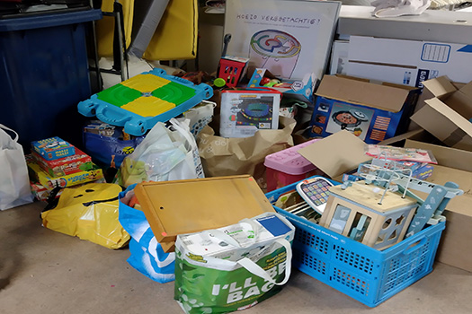 Gebrachte spullen die gesorteerd moeten worden op bruikbaarheid en vervolgens een plekje in de winkel moeten krijgen